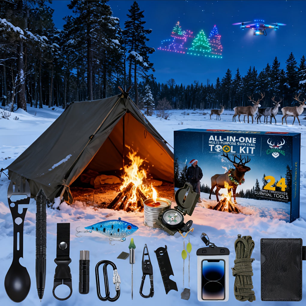 [TOP CHRISTMAS GIFTS] 24-Day Survival Advent Calendar - 24PCS Outdoor Survival Kit | Emergency Gear for Camping, Hiking, Fishing | Perfect Gifts for Him/Her, Men & Women | Includes Multi-Tool, Compass, Fire Starter, Paracord & First Aid
